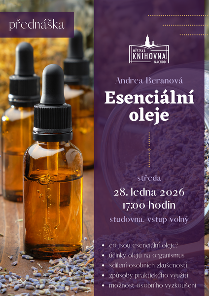 Ve středu 28. ledna pořádáme od 17:00 hodin ve studovně setkání věnované esenciálním olejům, při němž se dozvíte, co tyto přírodní vonné látky jsou a jak působí na lidský organismus. Andrea Beranová se podělí o zkušenosti z praxe a ukáže, jak oleje správně a bezpečně používat v každodenním životě. Součástí programu bude i praktická část, během níž si jednotlivé oleje vyzkoušíme na vlastní kůži. Vstupné dobrovolné.