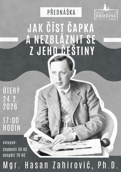 V úterý 24. února se těšíme na další návštěvu čapkologa Mgr. Hasana Zahiroviće. Jazyk Karla Čapka nám přiblíží v 17:00 hodin ve studovně. Vstupné 70 Kč, studenti 50 Kč.