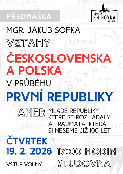 Ve čtvrtek 19. února pořádáme od 17:00 hodinve studovně přednášku věnovanou vztahům Československa a Polska v období první republiky. Přednáška vychází z bakalářské a diplomové práce Mgr. Jakuba Sofky a zaměřuje se zejména na otázky historických traumat, jejich kořeny a přetrvávající vliv do současnosti. Vstup volný.