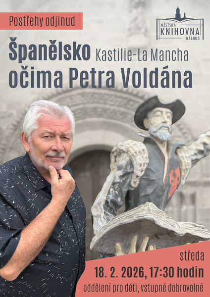 Ve středu 18. února vás od 17:30 hodin zveme do dětského oddělení na další cestovatelskou besedu s Petrem Voldánem. Jak se natáčejí Postřehy odjinud o tak známé postavě, jakou je rytíř Don Quijote de la Mancha? Kde ho mají marcipánu, které město je snad celé z keramiky a které vyvolává i v daleké Kastilii-La Mancha vzpomínky na Vamberk? Kde najdete “černou architekturu,” kde se nachází “Začarované město” nebo kam se vydat za unikátním lávovým vínem? Putování Španělskem nejen po stopách Karla Čapka doplní rozhlasový reportér kufříkem kuriozit z Kastilie-La Mancha.